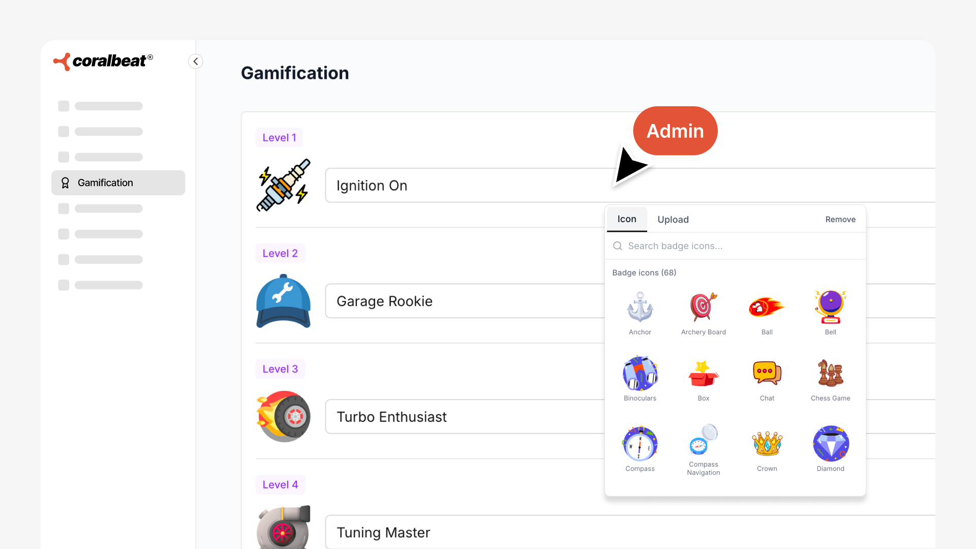Go to Settings → Gamification in your Admin Dashboard. Here you'll create up to 9 badge levels with custom names that fit your community brand.