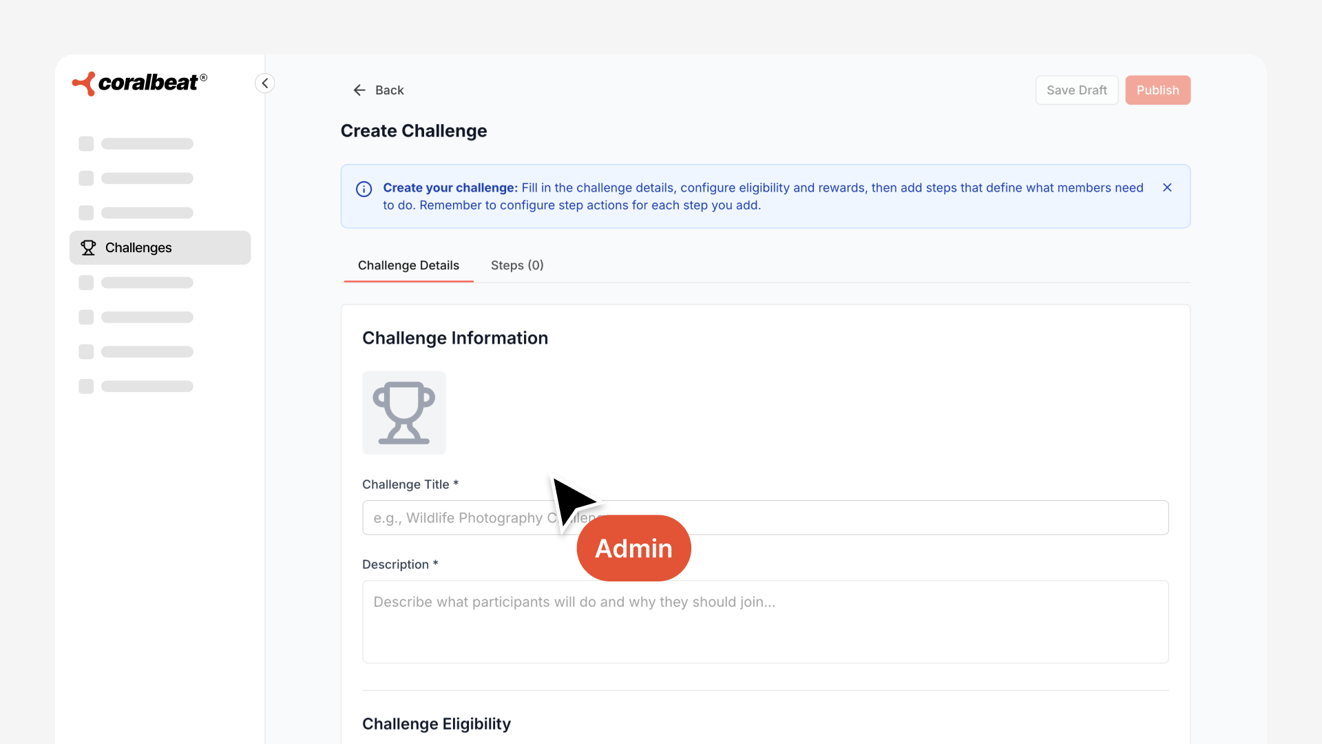Navigate to Community → Challenges in your Admin Dashboard and click Create Challenge.