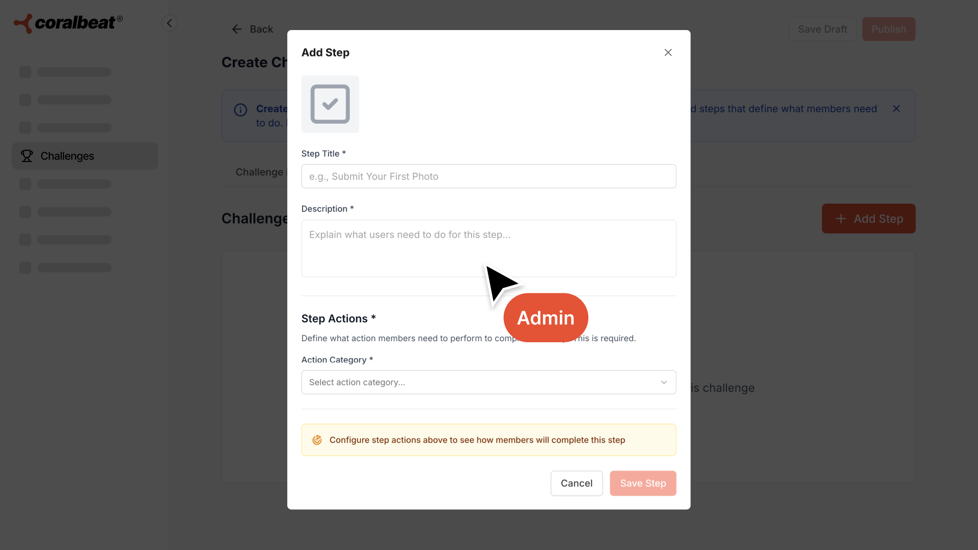 Once you've added all steps, you can Save as Draft to work on it later, or Publish immediately to make it available to members. Published challenges appear in the Community App where eligible members can discover and join them.
