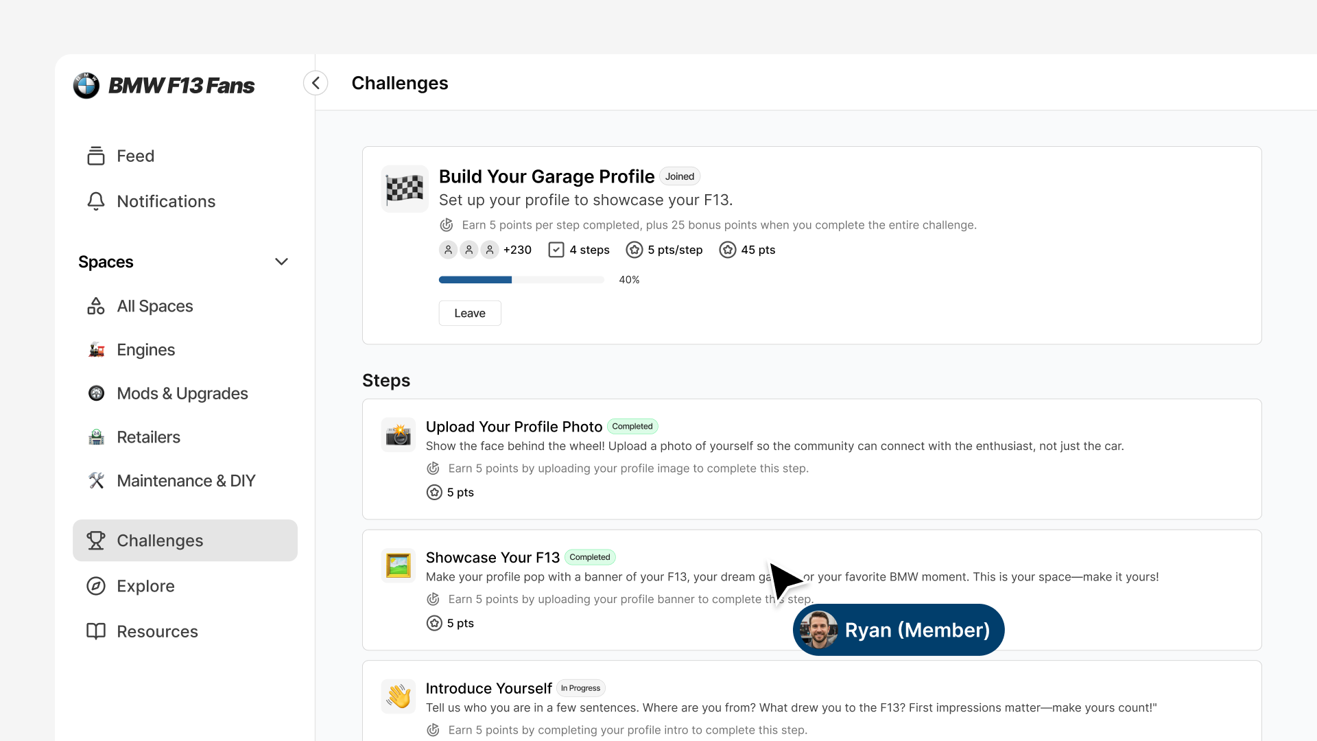 Members see their progress accumulate. Each completed step awards points. Complete an entire challenge to earn bonus points. Points add up toward badge level thresholds, creating visible progression on member profiles.