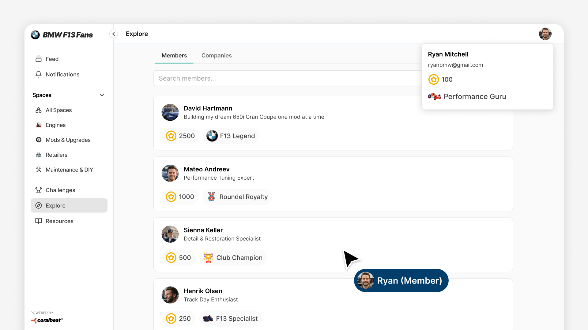 The member directory acts as a built-in leaderboard, displaying members with the most points at the top. Members can filter the directory by badge levels to see who's achieved specific milestones.