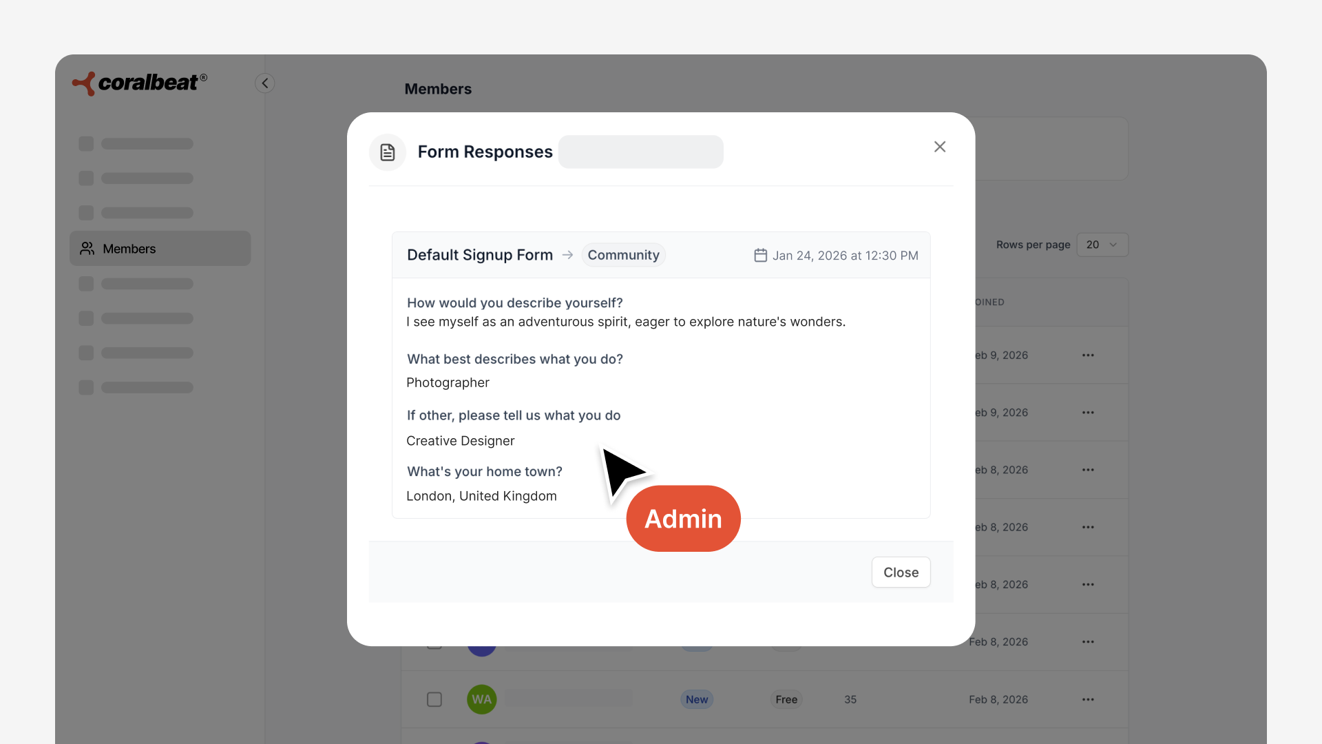 Every custom signup question lives with the member's profile permanently. Reference their interests, goals, or background when planning content. If members joined to learn about sustainability, you know to create more sustainability resources. If several mentioned they're startup founders, you know there's demand for founder-focused discussions.